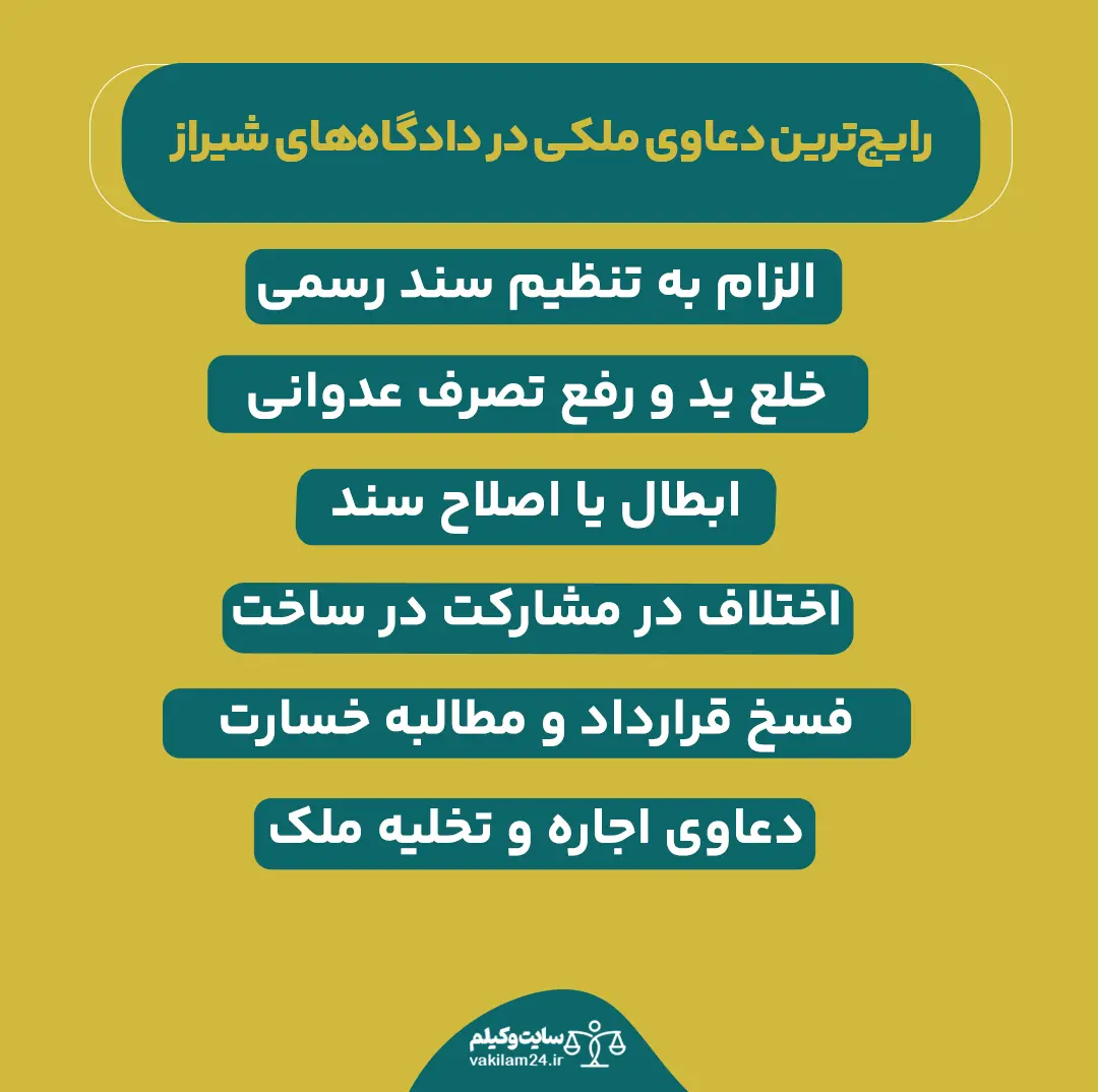 با اطلاعات حقوقی و قانونی که وکلای ملکی دارند اگر پیش از بستن قرارداد ملکی مشاوره حقوقی دریافت شود. حجم بسیاری از پروندههای ملکی در دادگاههای شیراز کم میشود. طبق بررسیهای انجام شده دعاوی زیر از بیشترین اختلافات ملکی در شیراز هستند.